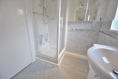 Modern shower room fitted with white suite comprising built in Mira shower unit, vanity unit and WC with concealed system