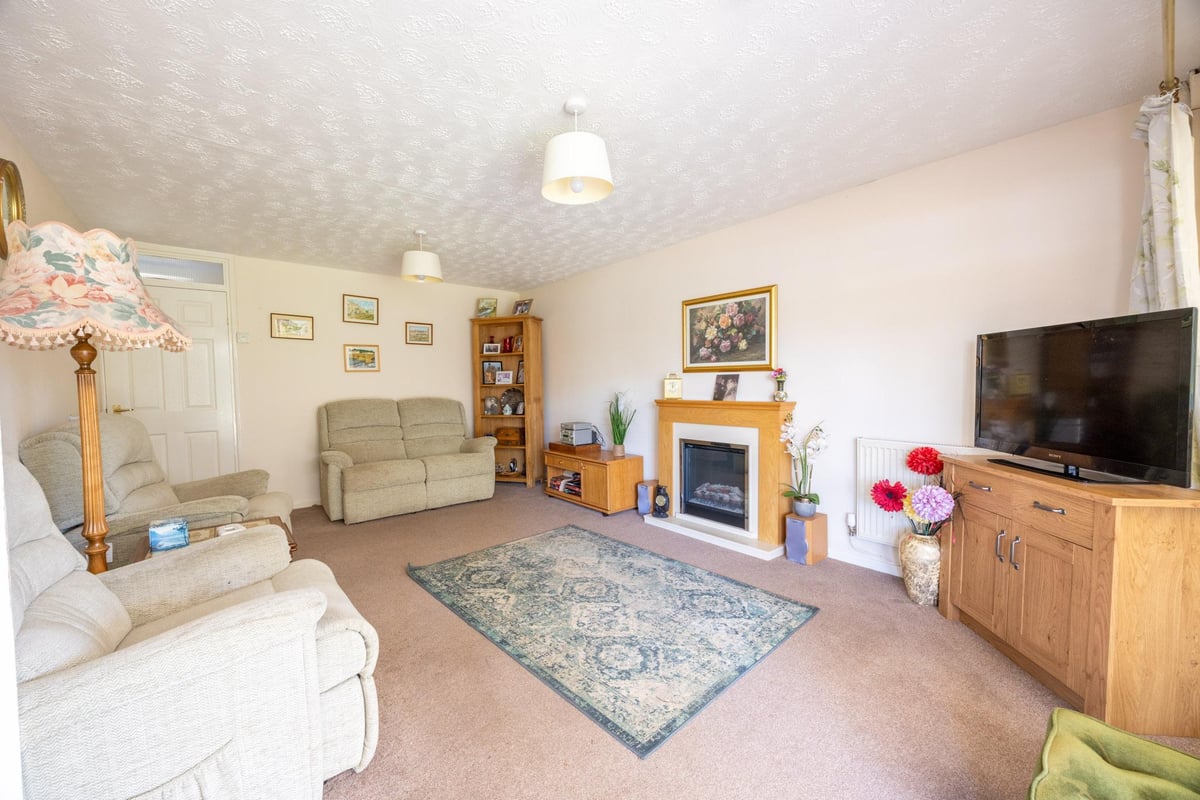 Exterior: blocked paved driveway offering hard standing for two vehicles leading to detached garage with remote controlled door, front garden being laid to lawn and stocked with roses and flower and shrub borders. Gated access to rear garden.