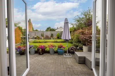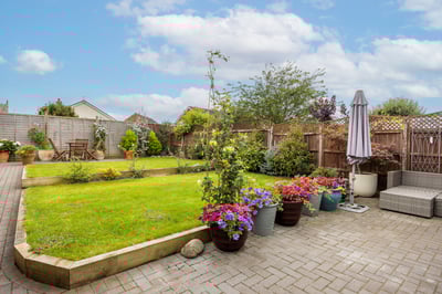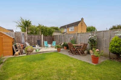 Rear garden: enclosed with wooden panel fencing having been landscaped with two separate patio areas, garden being laid to lawn and well stocked with flower and tree borders and garden shed.