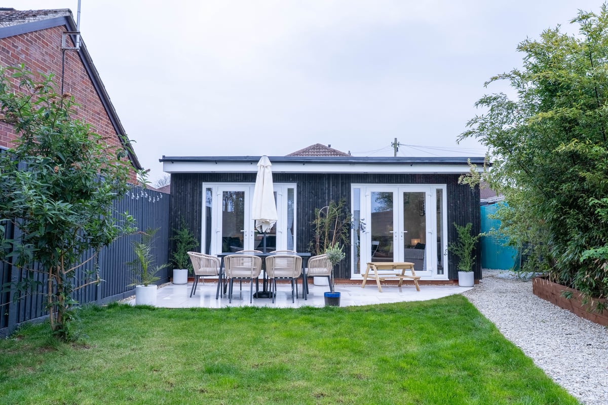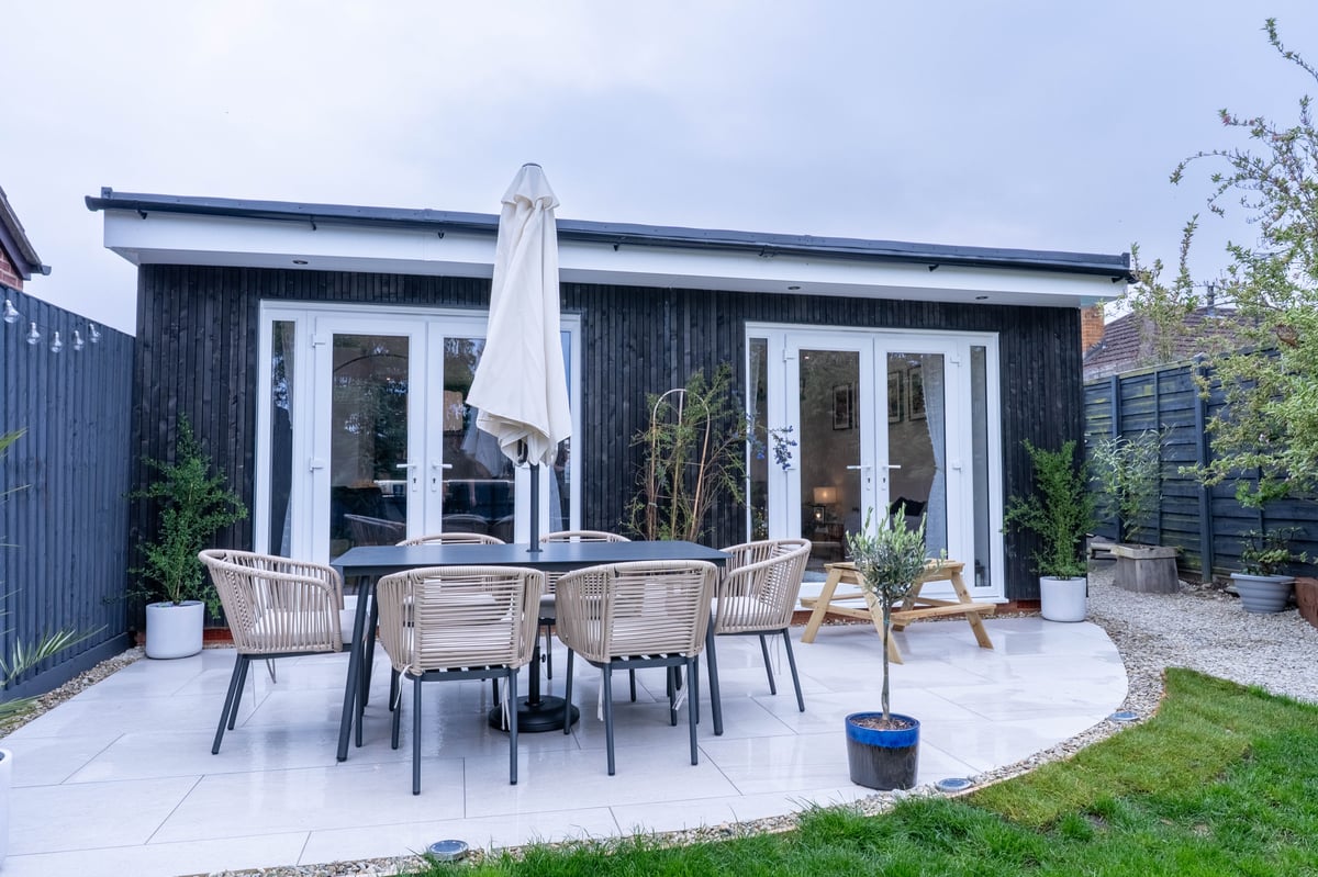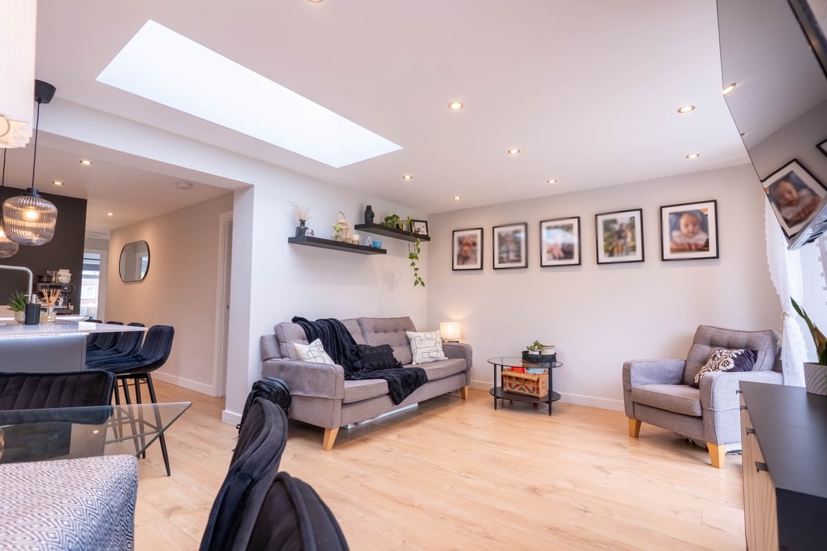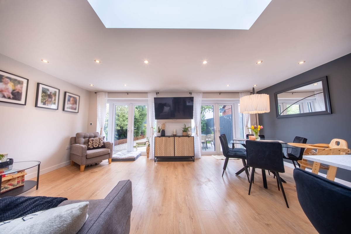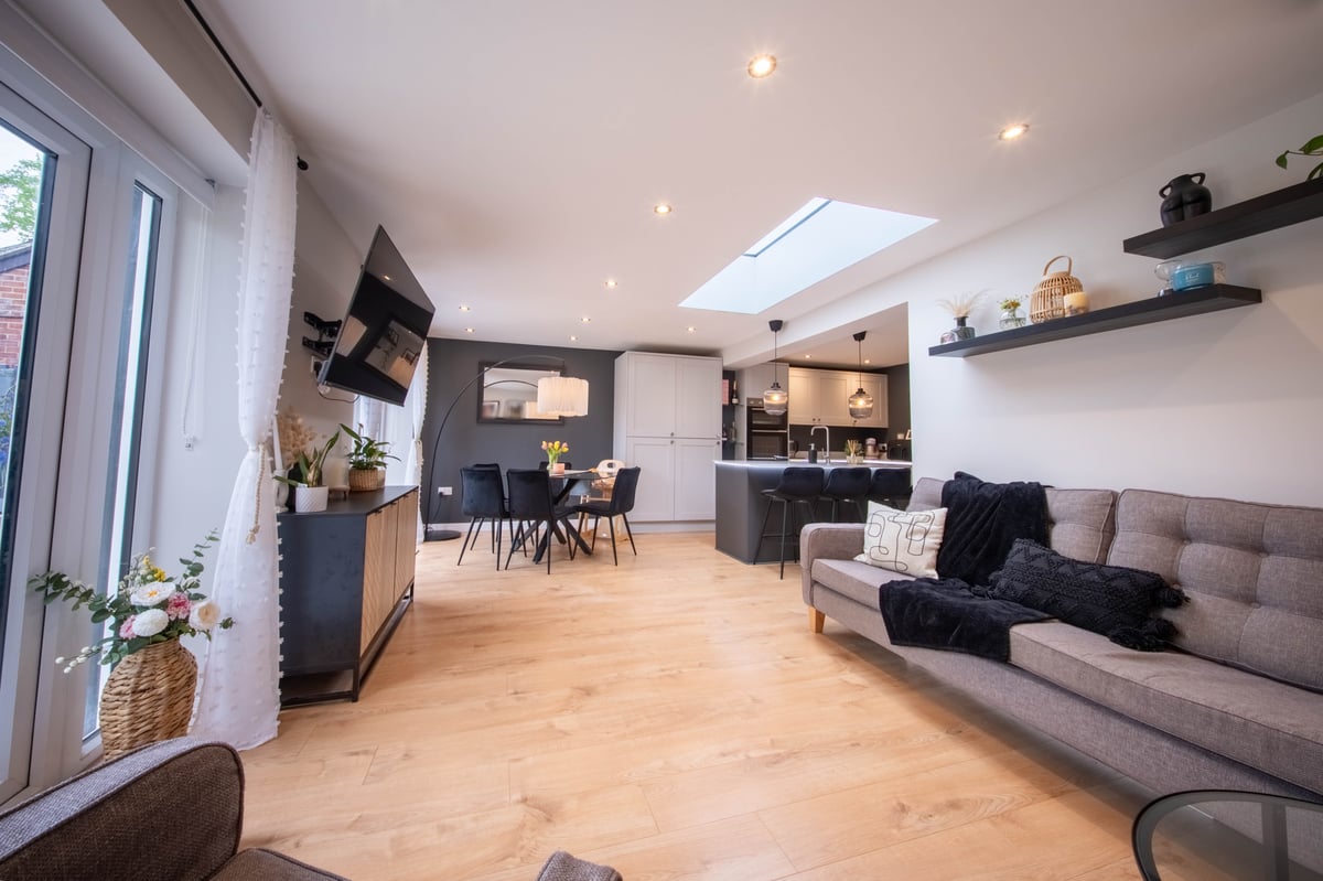 Entrance hall with cloaks and storage cupboard and doors to open plan lounge/dining/kitchen, bathroom and bedrooms one, two and three. Open plan lounge/dining/kitchen: two sets of French doors to patio and rear garden, roof lantern, extensively fitted kitchen comprising a matching range of eye and base level storage units with built-in and integrated appliances to include fan assisted oven, induction hob with extractor hood, dishwasher, washing machine, fridge-freezer, central island with breakfast bar with resin worktops, LED downlighting and wooden laminate flooring.