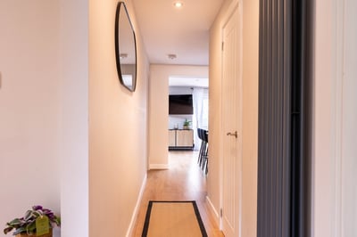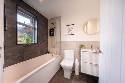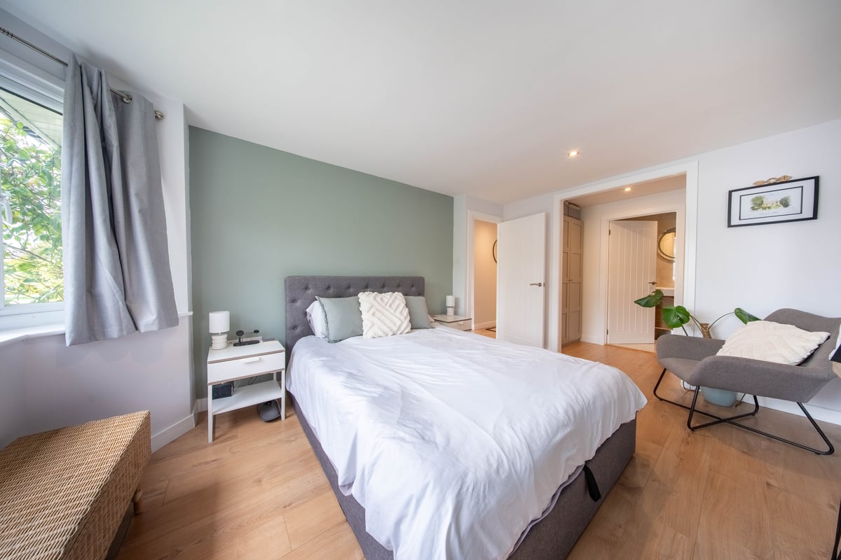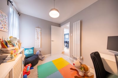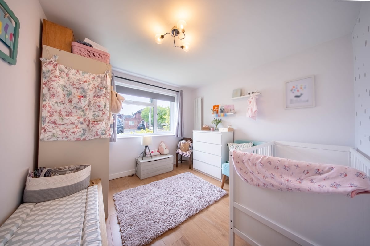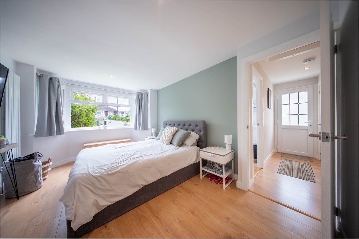 Bedroom one: bay window to front aspect, wooden laminate flooring, dressing area with door to en-suite. En-suite: fully tiled white suite comprising built-in shower with low level shower tray with rain style shower head, vanity unit, WC, dual fuel chrome heated towel rail and porcelain tiled splashbacking and flooring. Bedroom two: window to front aspect and wooden laminate flooring. Bedroom three: window to side aspect. Bathroom: window to side aspect, modern white suite comprising bath, vanity unit, WC and part porcelain and part ceramic tiled splashbacking and flooring,