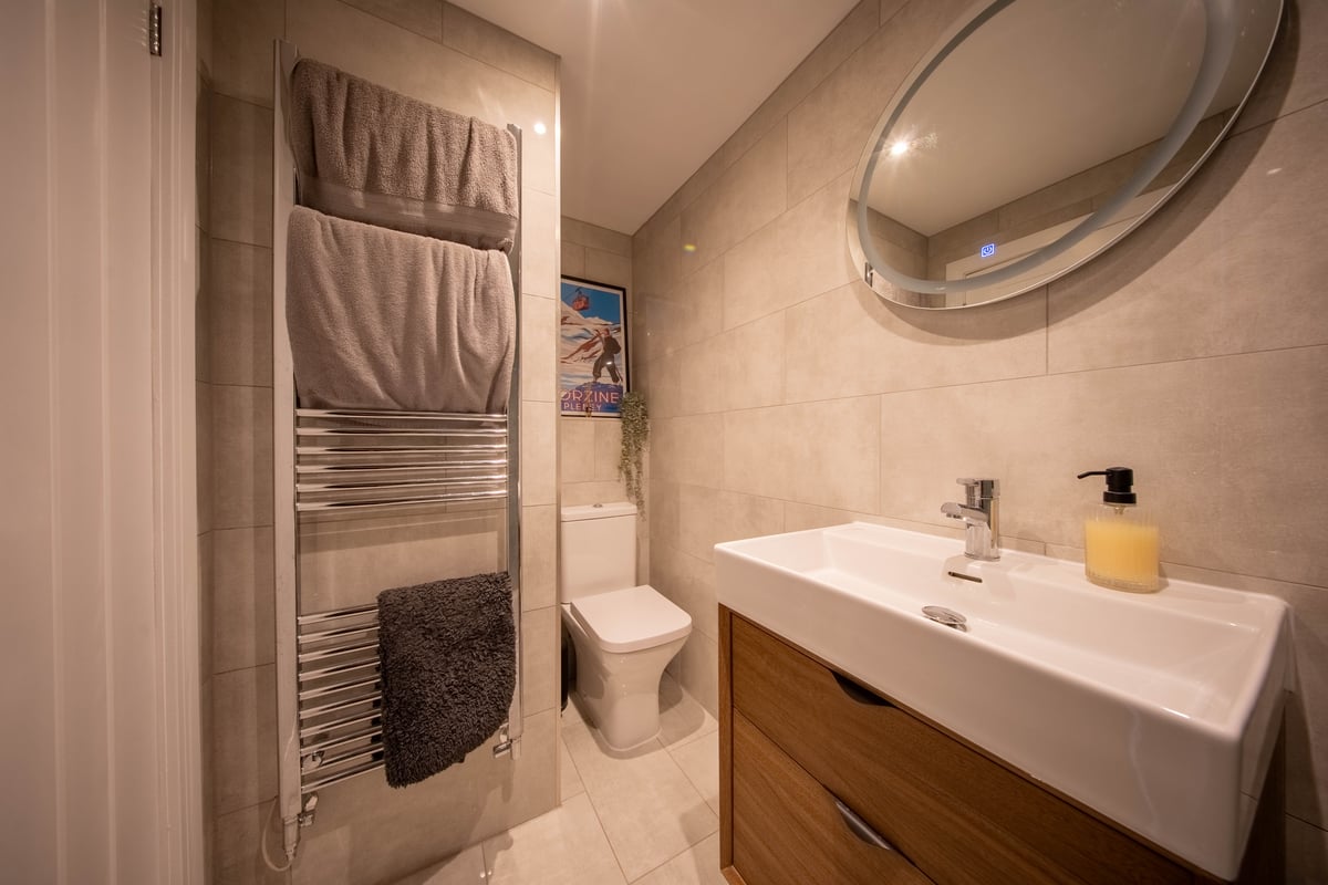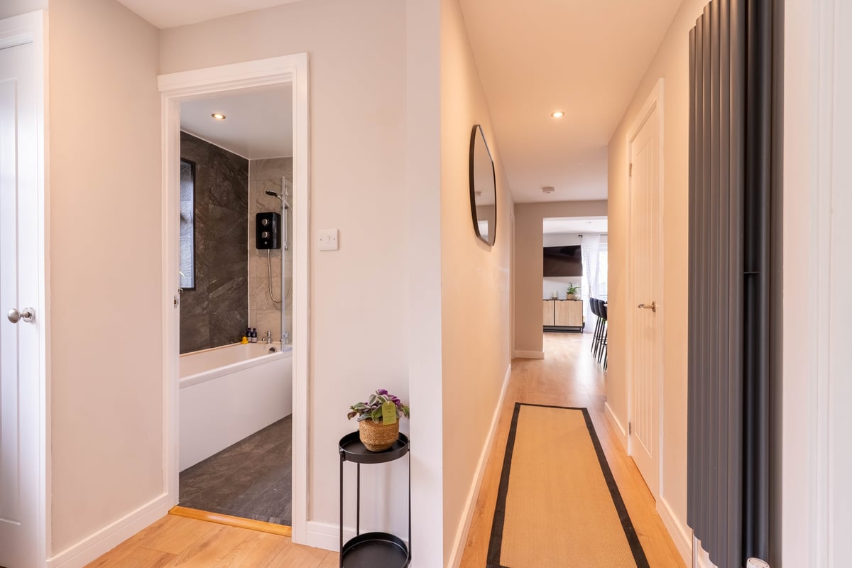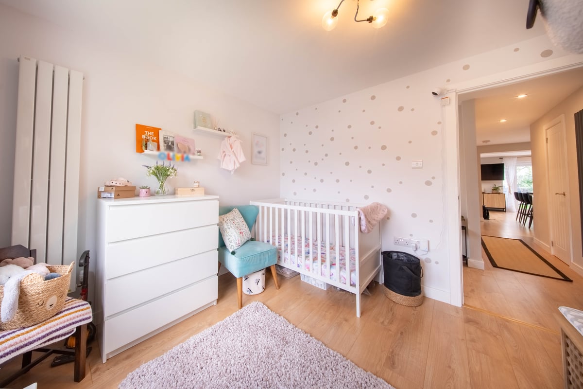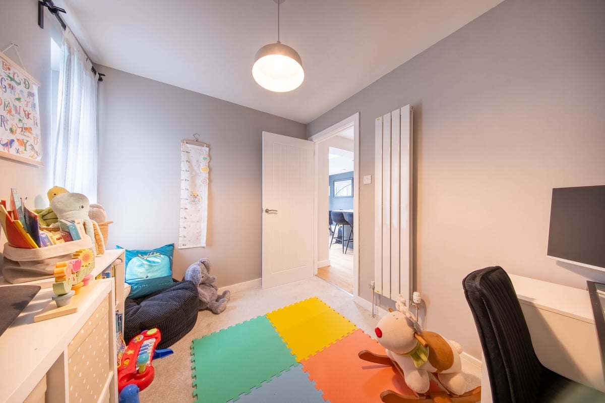 Bedroom one: bay window to front aspect, wooden laminate flooring, dressing area with door to en-suite. En-suite: fully tiled white suite comprising built-in shower with low level shower tray with rain style shower head, vanity unit, WC, dual fuel chrome heated towel rail and porcelain tiled splashbacking and flooring. Bedroom two: window to front aspect and wooden laminate flooring. Bedroom three: window to side aspect. Bathroom: window to side aspect, modern white suite comprising bath, vanity unit, WC and part porcelain and part ceramic tiled splashbacking and flooring,