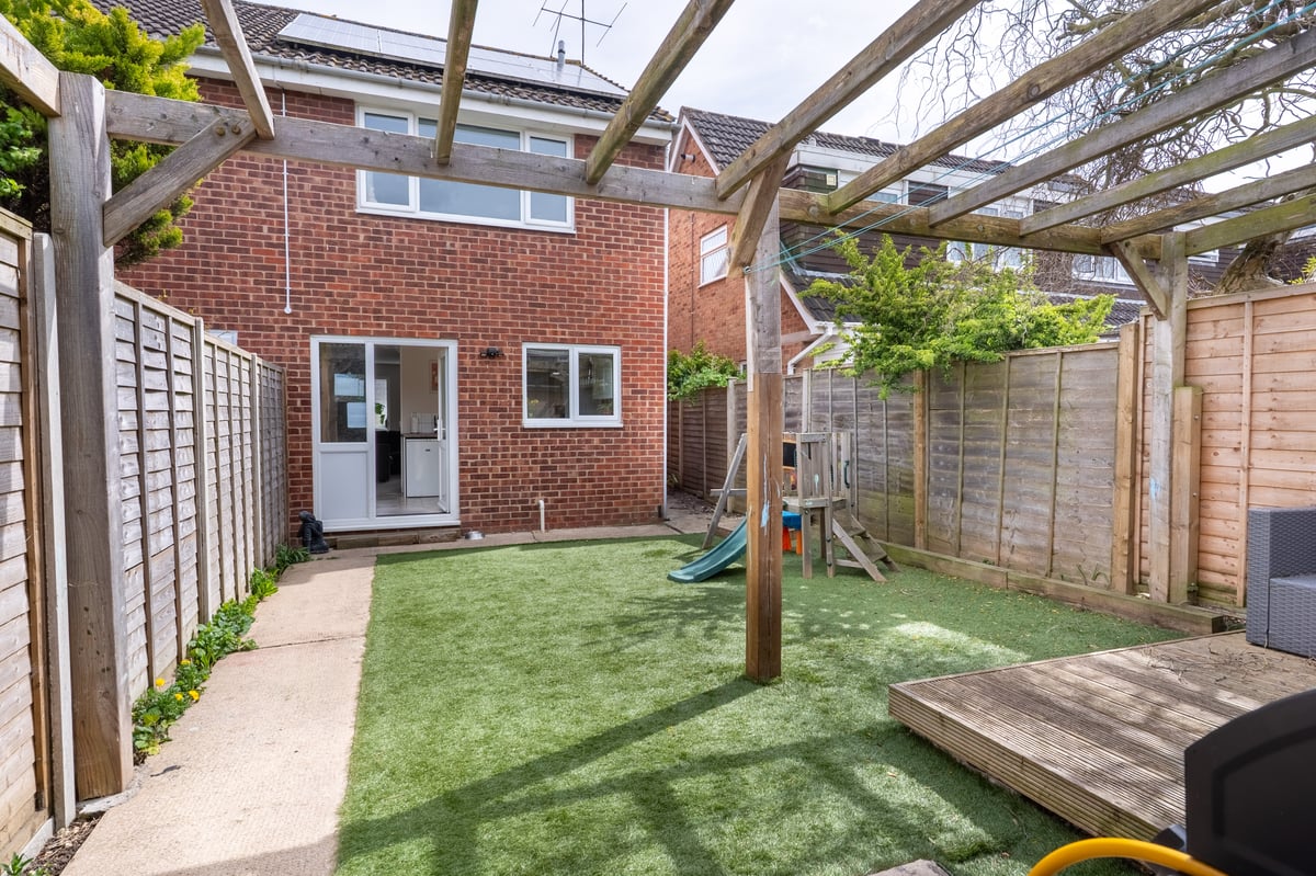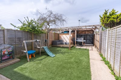 Front garden being mainly laid to lawn with rose bushes and flower and shrub borders and gated side access to rear garden. Rear garden: enclosed with wooden panel fencing, wooden decking and laid to Astro turf, to the rear of the property there are double wooden gates giving access for parking for two vehicles and car port.