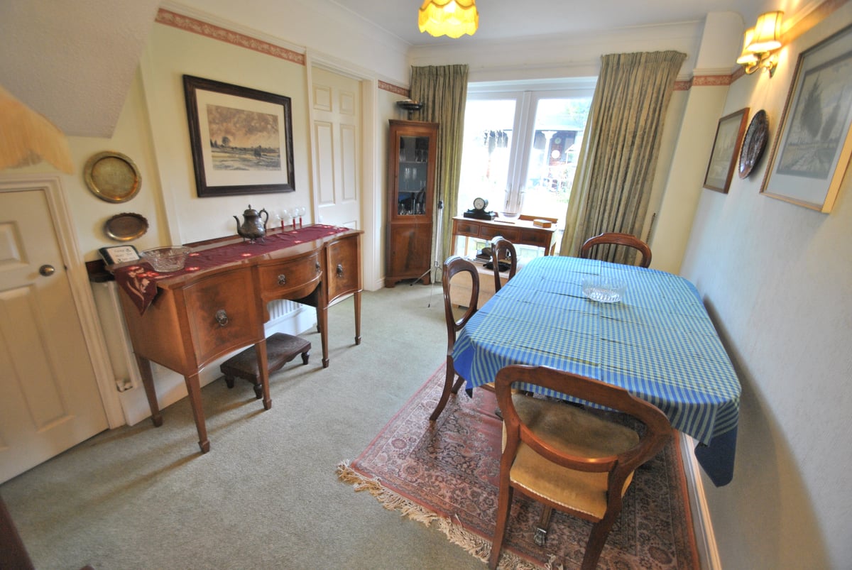Entrance hall with doors to cloakroom and lounge, cloakroom with vanity unit and WC. Lounge: bay window to front aspect, stone fireplace fitted with gas coal effect flame fire (not tested), stairs to landing and first floor living accommodation, archway to dining room and door to kitchen. Dining room: French doors to patio and rear garden, built-in storage cupboard. Kitchen: window to rear garden and door to side aspect, fitted with a matching range of cupboard units, space and plumbing for washing machine, gas and electric cooker points and appliance space.
