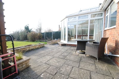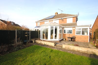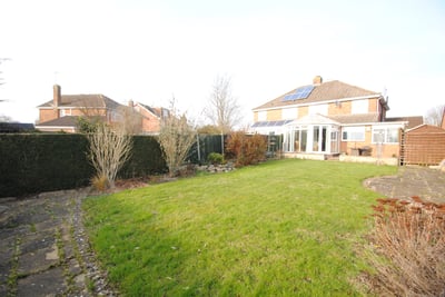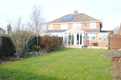 Exterior: front garden being enclosed with walling and hedging, being laid to lawn with various flower and shrub borders, block paved driveway for three vehicles leads to a garage with double doors. Side access leading to generous South West facing rear garden with patio, being laid to lawn and stocked with various flower and shrub borders, backing onto open fields. Garden shed.