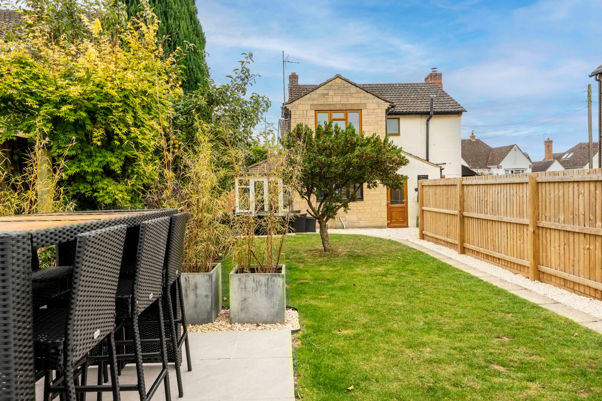 Exterior: front garden being enclosed with Cotswold stone walling, a stone chipped driveway for approximately three vehicles leads to a detached double garage. Rear garden: attractive enclosed landscaped garden being laid to lawn and stocked with various trees and flower and shrub borders and two separate patio areas.