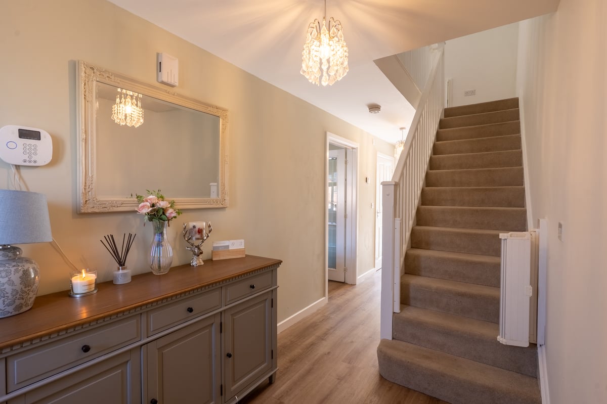 Entrance hall with doors to storage cupboard, cloak room, lounge, kitchen/dining room and stairs to first floor living accommodation. Cloakroom: with modern white suite. Lounge: window to front aspect. Kitchen/ dining room: window and patio doors to rear garden, fitted with a modern matching range of eye and base level storage units with built-in and integrated appliances to include fan-assisted oven, ceramic hob with extractor hood and dishwasher, door to utility room. Utility room: appliance space.