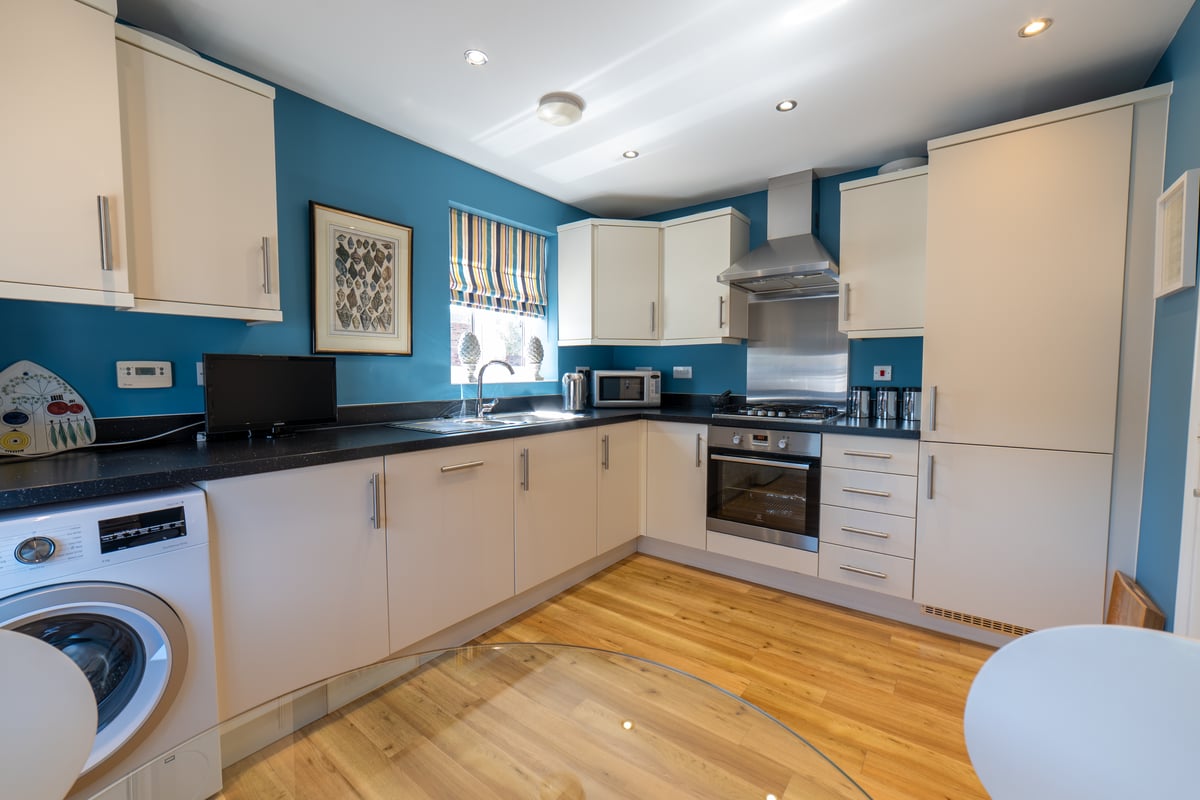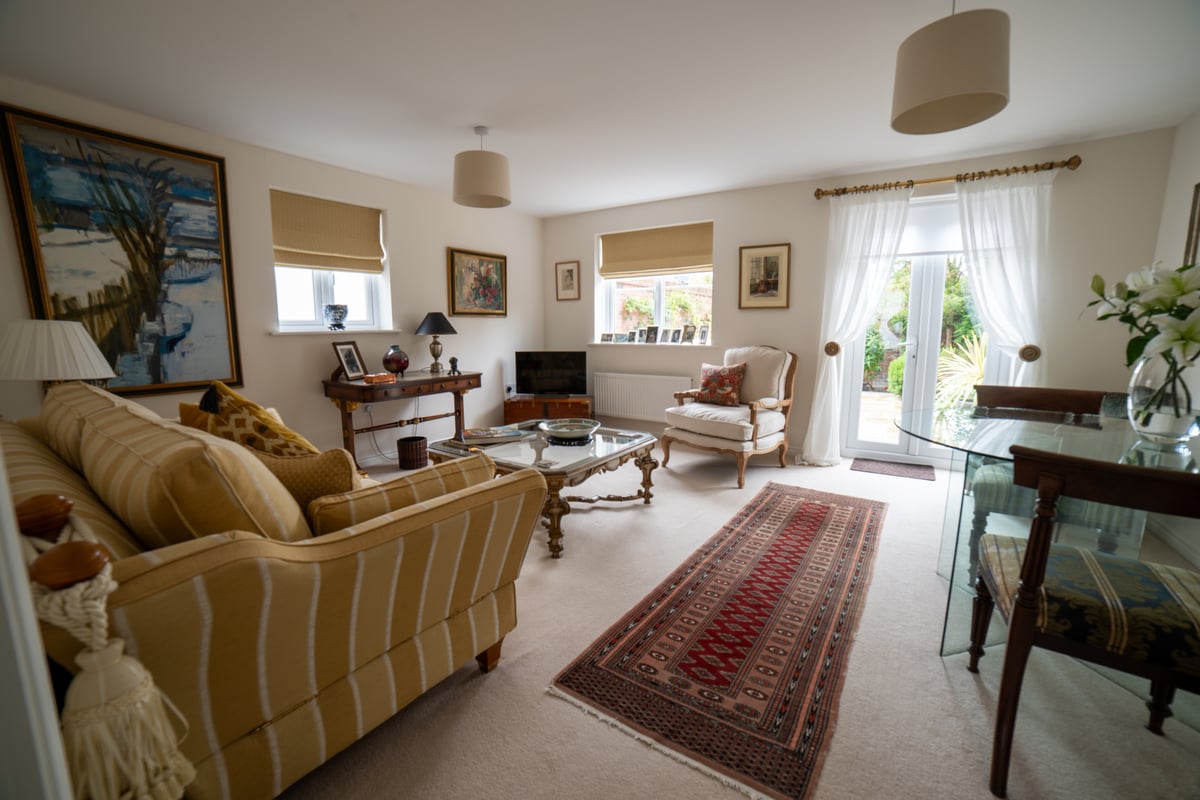 Entrance hall with under stairs storage cupboard, cloakroom, doors to lounge/ dining room, kitchen/ breakfast room and stairs to first floor. Cloak room: comprising modern white suite with ceramic tiled flooring. Lounge/ dining room: double aspect windows and French doors to patio and enclosed rear garden. Kitchen/ breakfast room: double aspect windows fitted with a modern matching range of eye and base level storage units with built-in and integrated appliances to include fan-assisted oven, gas hob extractor hood, fridge-freezer and dishwasher, appliance space, matching cupboard housing gas boiler and Amtico wood effect flooring.