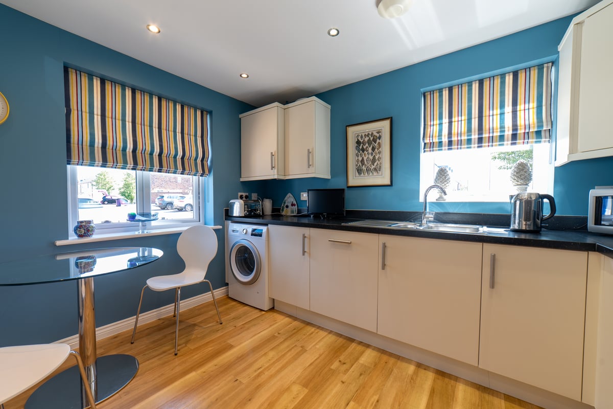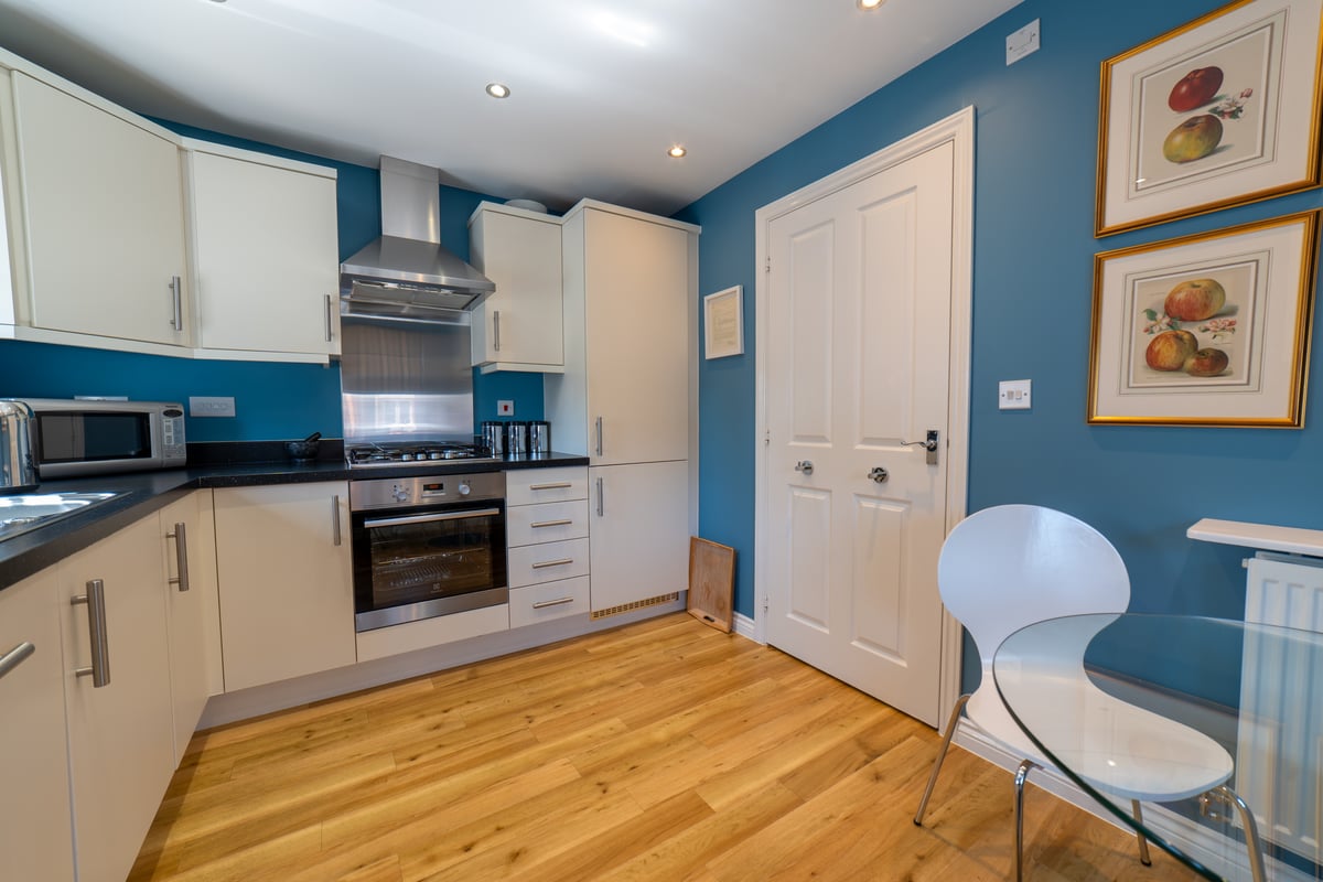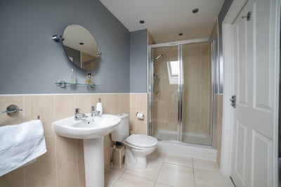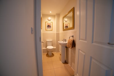 Second floor, bedroom one: window to front aspect, built-in storage cupboard, large built-in wardrobe and door. En suite: modern white suite comprising built-in shower with tiled splashbacking, wash hand basin, WC, chrome heated towel radiator and ceramic tiled flooring.