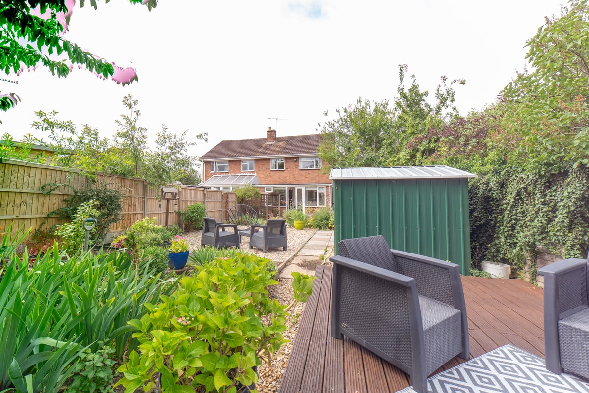 Exterior: front garden being mainly laid to stone chippings and well stocked with various flower and shrub borders, a driveway offering hardstanding for approximately three vehicles leads to a garage and side gate to rear garden. Rear garden: generous enclosed garden being laid to stone chippings, benefiting from two separate patio areas, wooden decking and being well stocked with various flower and shrub borders.
