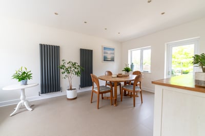 • Dining/Family Room: Dual-aspect windows with garden views, built-in airing cupboard, and door to rear patio.