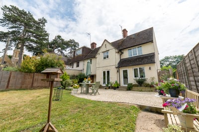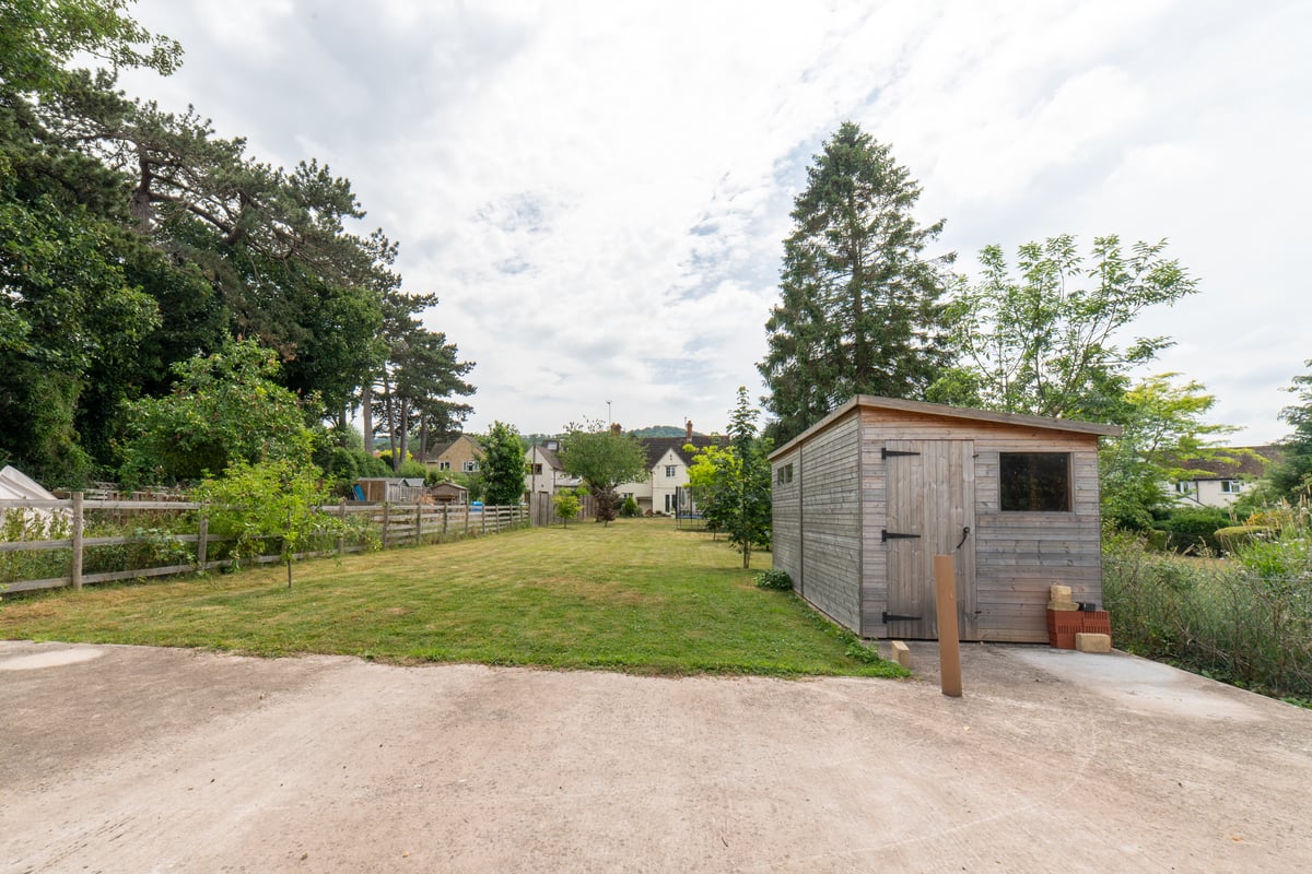 • Rear Garden: Exceptionally large, with a Cotswold stone-chipped patio and expansive lawn bordered by mature trees, flowers, and shrubs. At the rear is a large concrete plinth with trunking laid from the house—ready for a garden room or summer house.