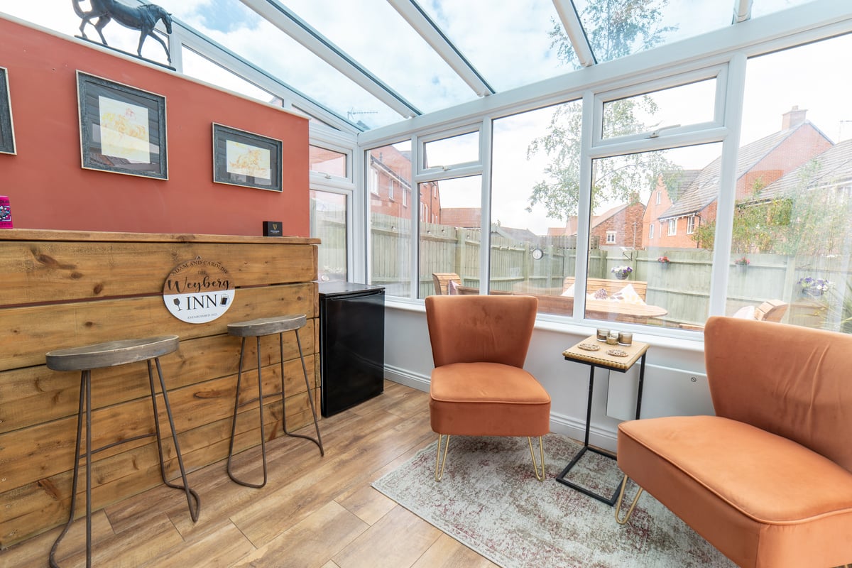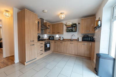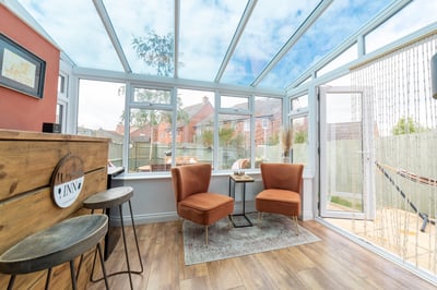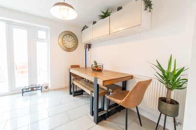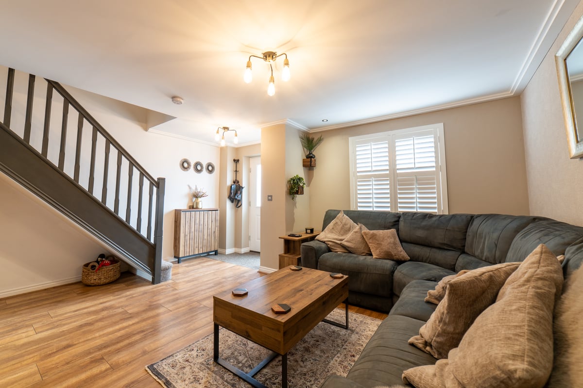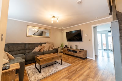 Entrance porch leading to lounge. Lounge: window to front aspect with window shutters, wooden effect flooring and stairs to landing and first floor living accommodation, door to inner hall with doors to separate toilet and cloakroom. Toilet: modern white suite with tiled splash backing, wash hand basin and WC. Kitchen/dining room: French doors to conservatory, modern fitted kitchen fitted with a matching range of eye and base level storage units, with built-in and integrated appliances to include fan-assisted oven, gas hob with extractor hood, integrated fridge-freezer, dish-washer and washing machine, large ceramic tiled flooring and matching cupboard housing gas combination boiler. Conservatory: windows and French door to rear garden and wooden effect style flooring.
