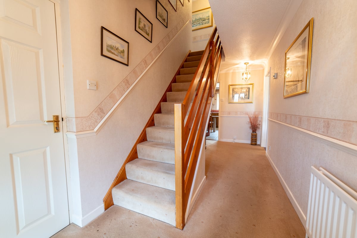 Entrance hall with doors to cloakroom, lounge, kitchen/breakfast room, integral garage and stairs to first floor living accommodation. Lounge: window to front aspect, feature fireplace fitted with gas coal effect flame, archway to dining room, double glazed door to patio and rear garden and door to kitchen/breakfast room. Kitchen/breakfast room: fitted with a matching range of eye and base level storage units with built-in fan assisted oven, ceramic hob and extractor hood, integrated fridge-freezer and door to utility room. Utility room: matching range of eye and base level storage units, appliance space, wall mounted gas boiler and door to rear garden.
