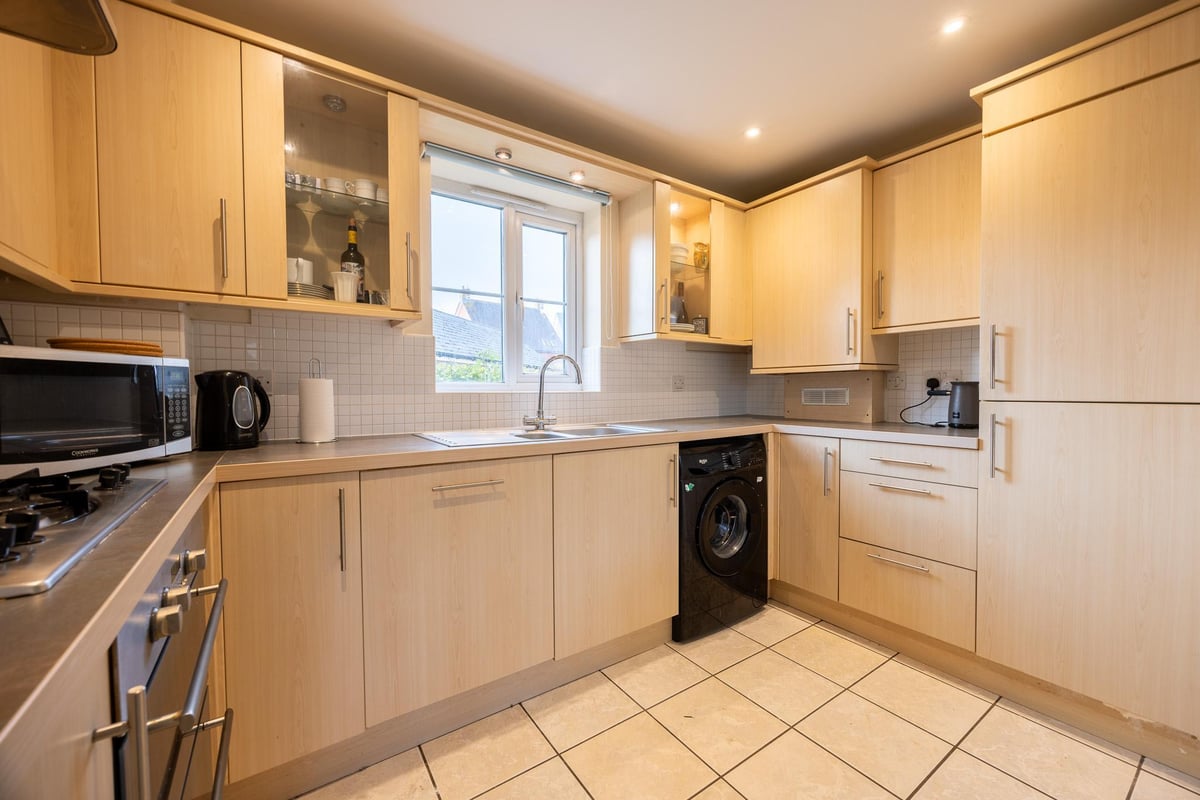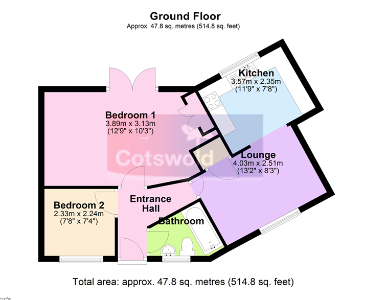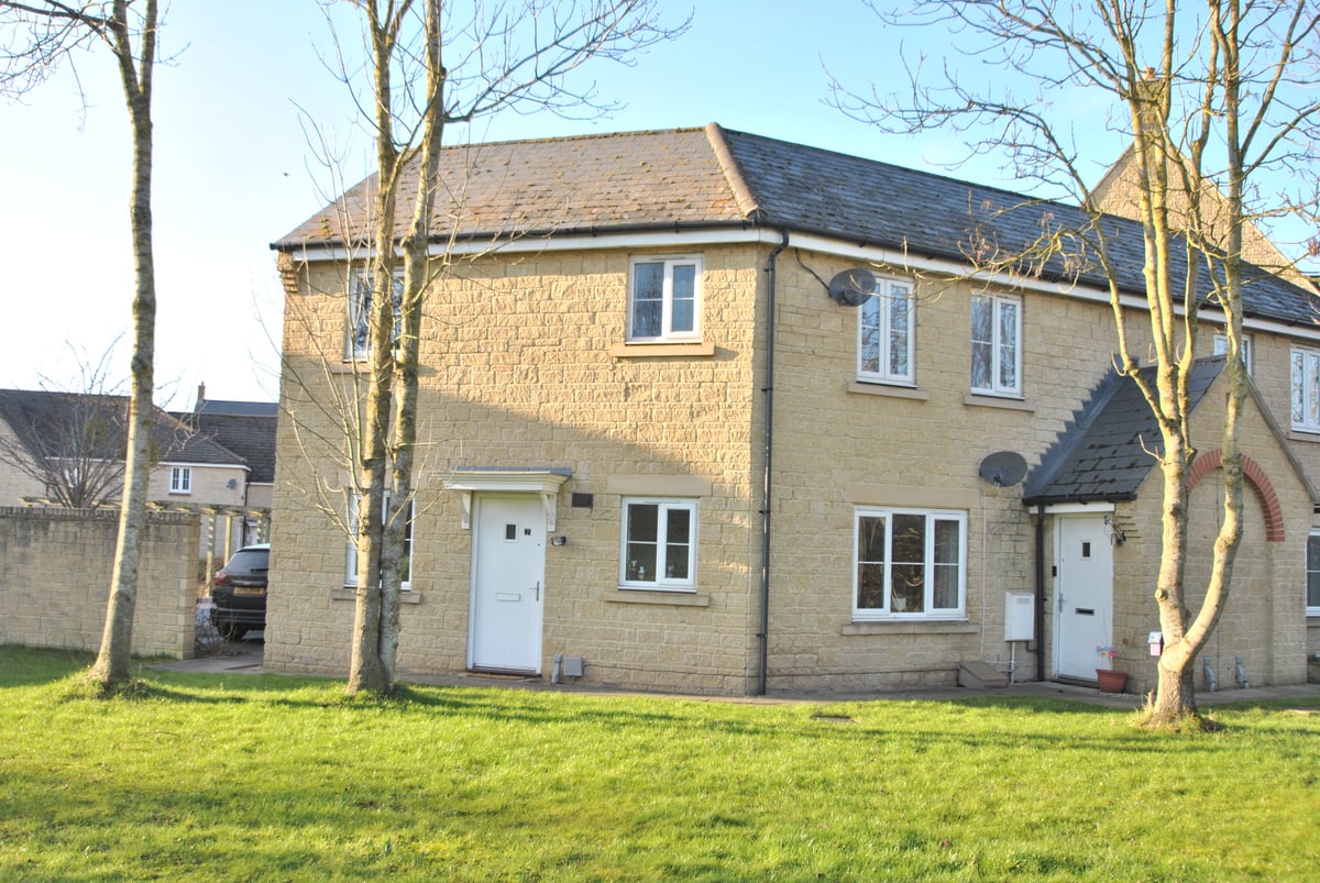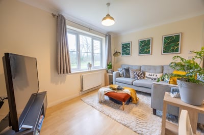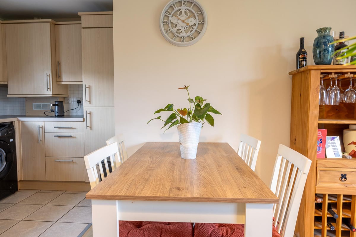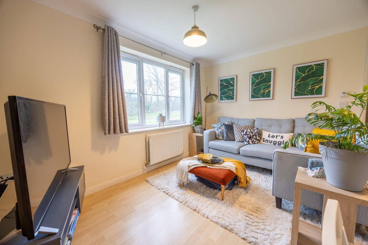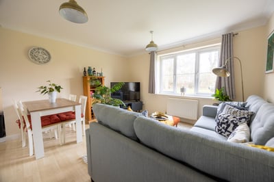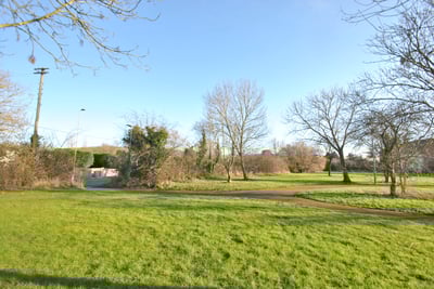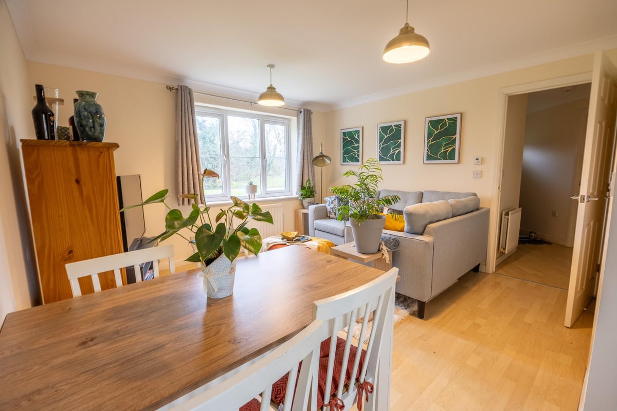 Entrance porch to entrance hall with doors to open plan lounge/dining/kitchen, bathroom and bedrooms one and two. Open plan lounge/dining/kitchen: window with lovely views over open green, large walk-in storage cupboard and wooden laminate flooring. Kitchen area: window to rear aspect, ceramic tiled flooring and fitted with a matching range of eye and base level storage units with built-in and integrated appliances to include fan assisted oven, gas hob and extractor hood, integrated dishwasher and fridge freezer, space and plumbing for washing machine. Bathroom: window to side aspect, modern white suite comprising bath with tiled splashbacking fitted with shower unit, hand basin and WC. Bedroom one: French doors to rear garden, wooden laminate flooring and built-in double wardrobe. Bedroom two: window with views over open green and wooden laminate flooring.